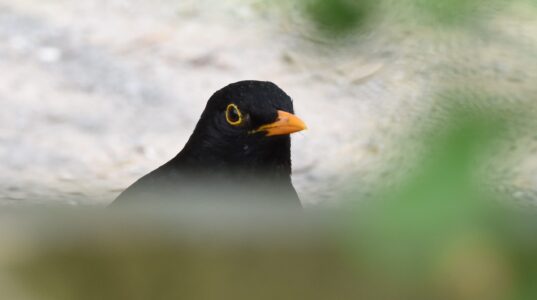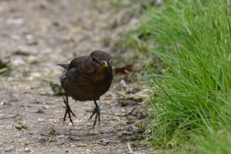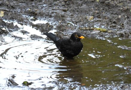Male blackbirds are jet black in colour with a bright yellow bill and a yellow ring around the eye. Females are a duller brown colour with faint dark spotting on the underparts and a browner bill and no yellow ring around the eye. In both sexes the legs and feet are similar in colour to the plumage.