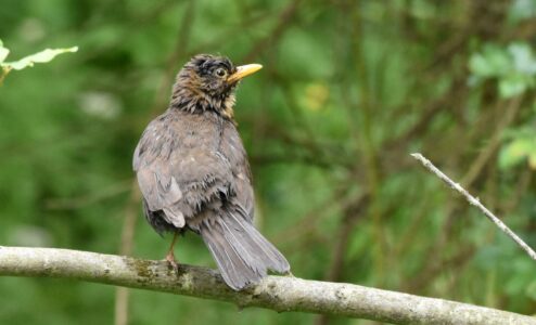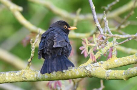 The blackbird has spread into towns from its original home in woodland. It still mainly nests in trees, building a cup shaped nest. It feeds on invertebrates such as insects and also wild fruits.