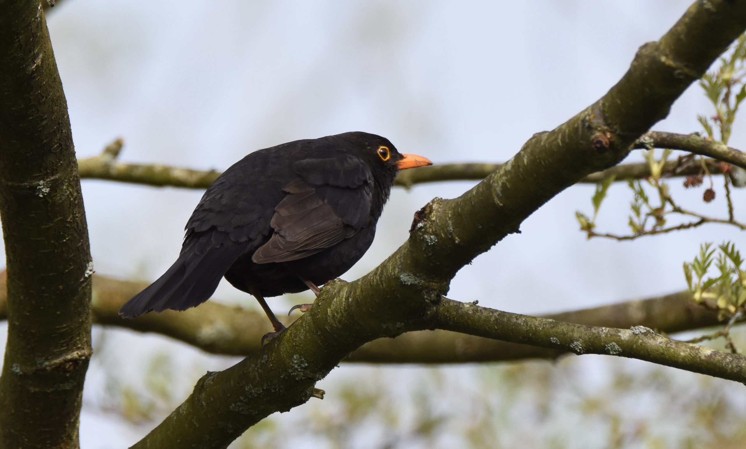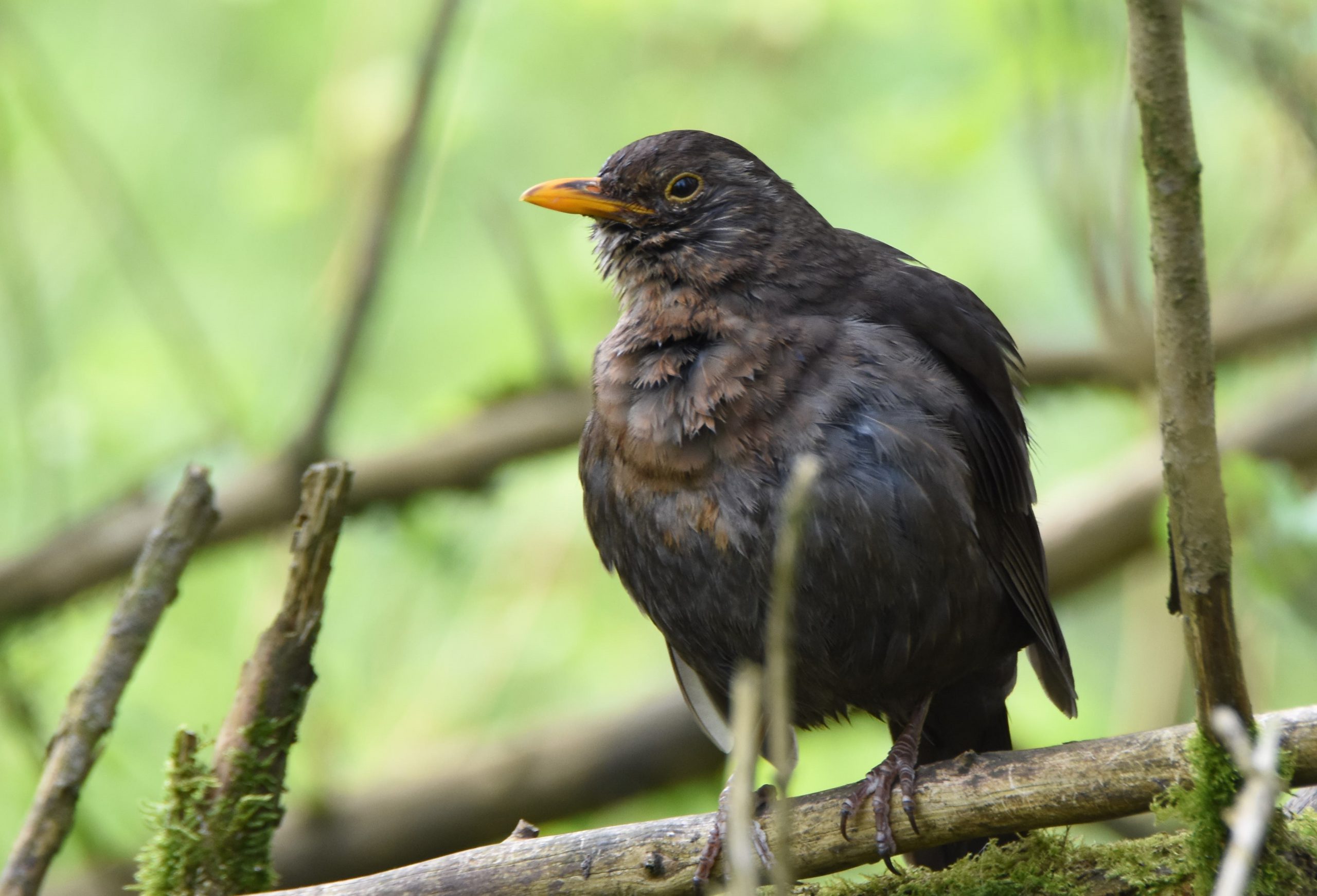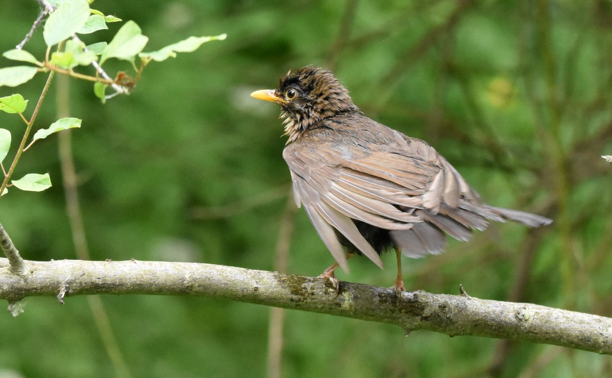 Male blackbirds are jet black in colour with a bright yellow bill and a yellow ring around the eye. Females are a duller brown colour with faint dark spotting on the underparts and a browner bill and no yellow ring around the eye. In both sexes the legs and feet are similar in colour to the plumage.