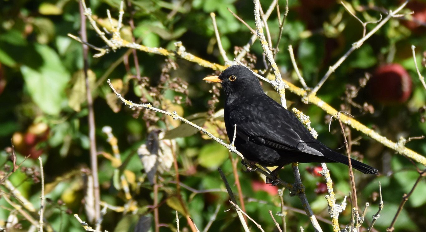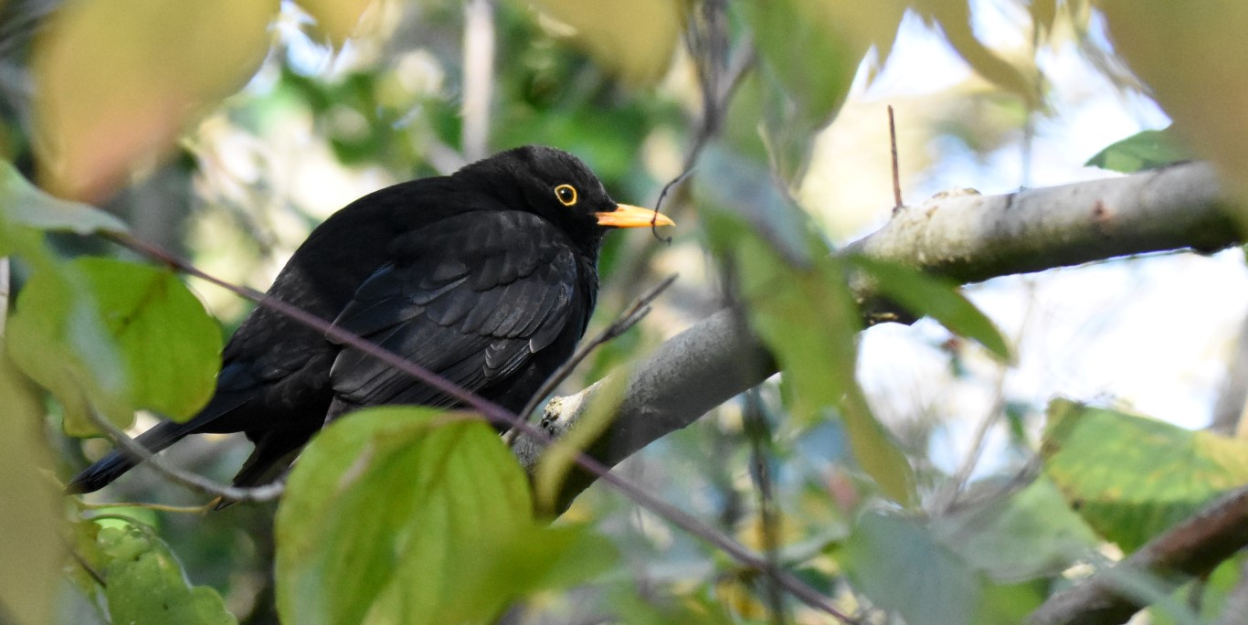 The blackbird has spread into towns from its original home in woodland. It still mainly nests in trees, building a cup shaped nest. It feeds on invertebrates such as insects and also wild fruits.