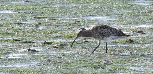 The Curlew is a large wading bird. The bill is distinctive being very long, thin and slightly curved downwards. It is evenly streaked with brown and black markings and has no obvious eye stripe. The underparts are paler than the back and wings. The legs are long and dark green in colour.