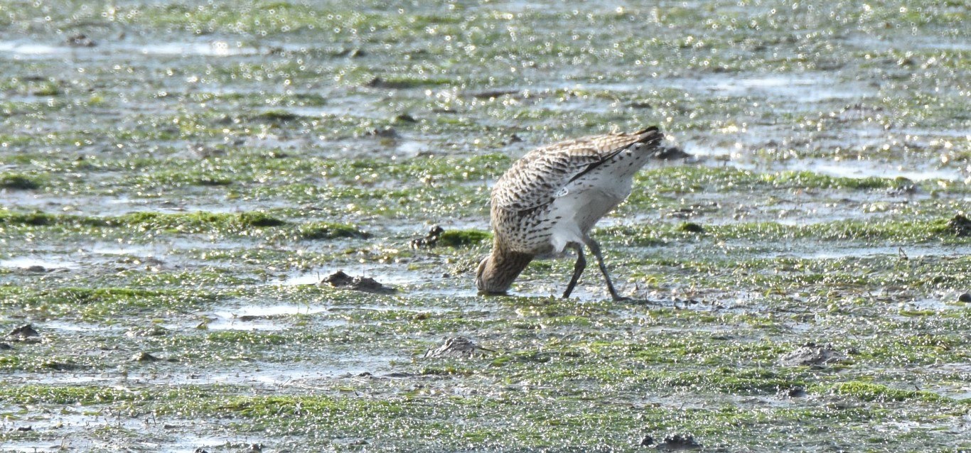 The Curlew is a large wading bird. The bill is distinctive being very long, thin and slightly curved downwards. It is evenly streaked with brown and black markings and has no obvious eye stripe. The underparts are paler than the back and wings. The legs are long and dark green in colour.
