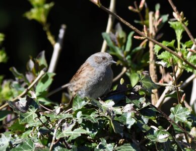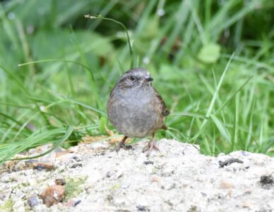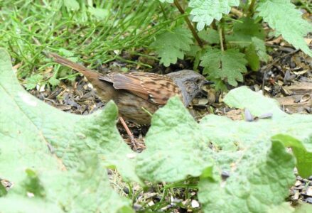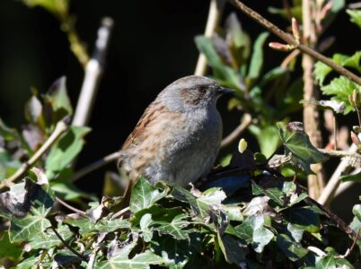The Dunnock is a small common bird often mistaken for a sparrow. However, unlike a sparrow it has a grey face and chest and a slender bill. The back and wings are a streaked brown colour with a thin white stripe on each wing.