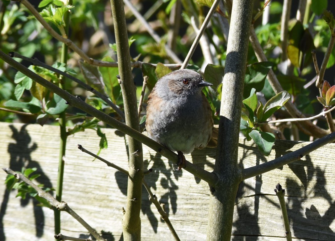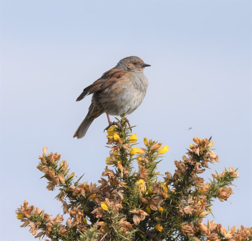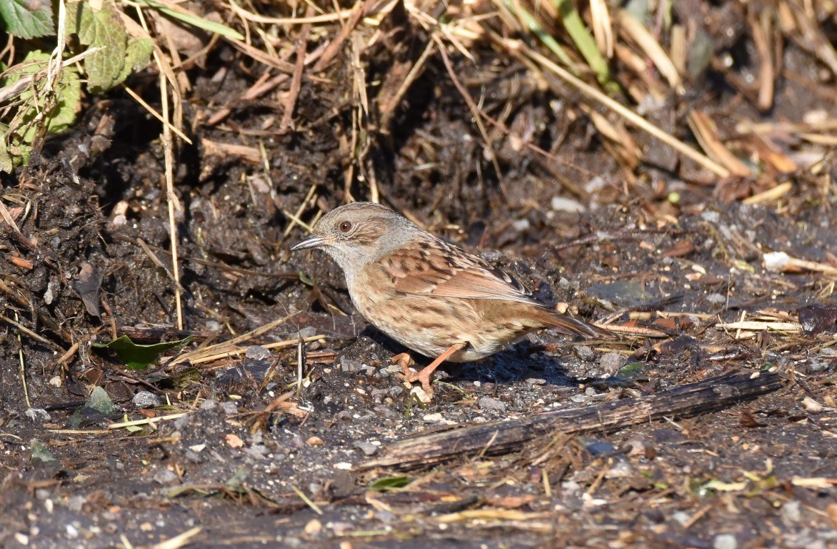 The Dunnock is a small common bird often mistaken for a sparrow. However, unlike a sparrow it has a grey face and chest and a slender bill. The back and wings are a streaked brown colour with a thin white stripe on each wing.