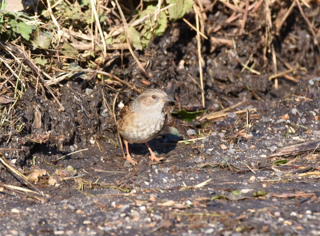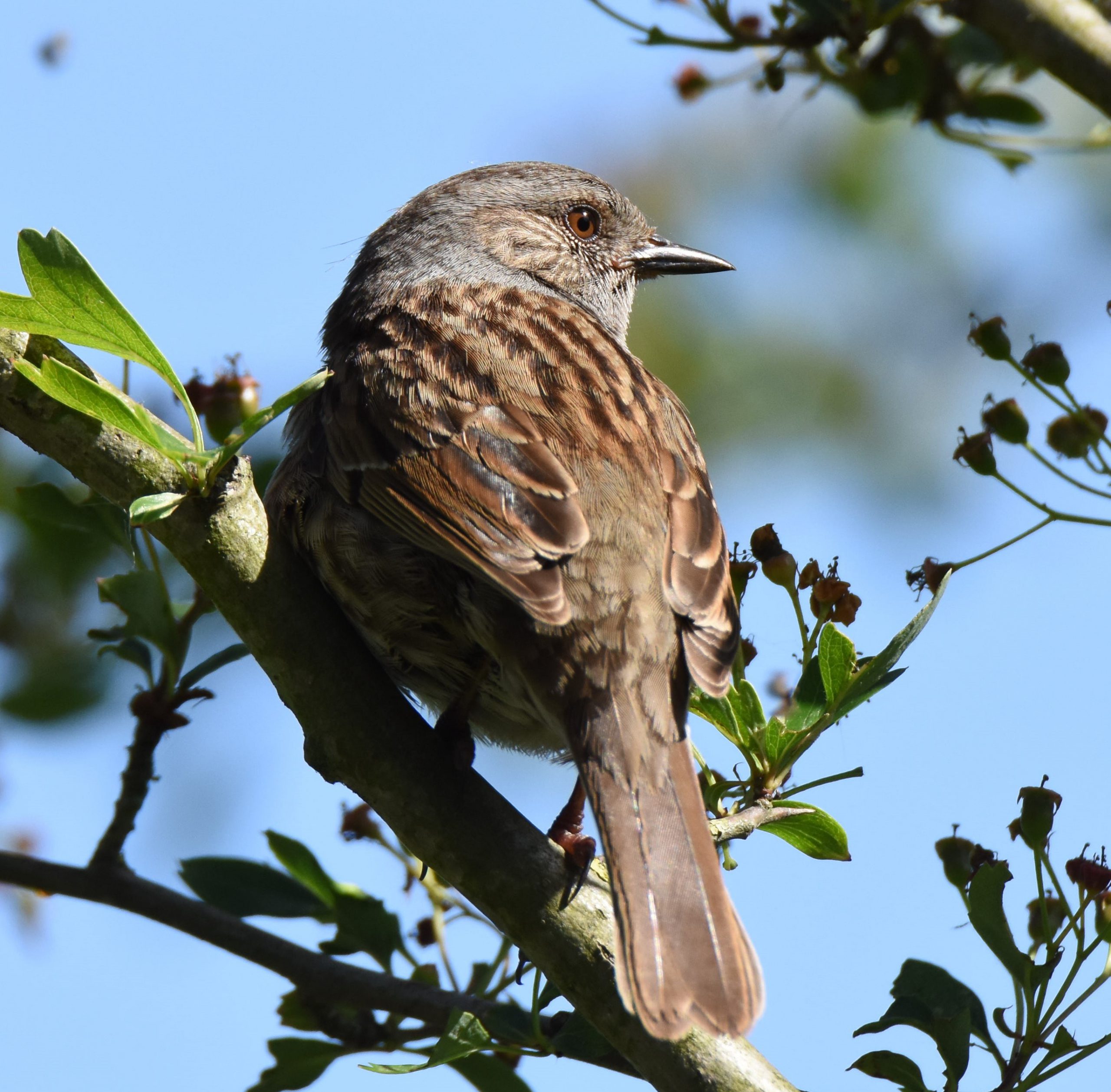 The Dunnock sings from perches in trees and hedges to defend its territory. It uses its thin bill to pick out invertebrates from the soil underneath hedges and bushes, hopping and flicking its wings as if just about to take flight.