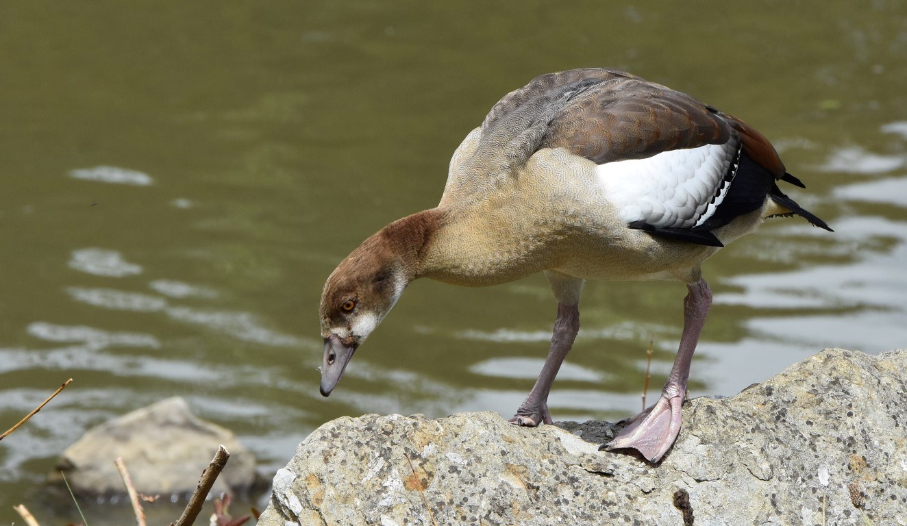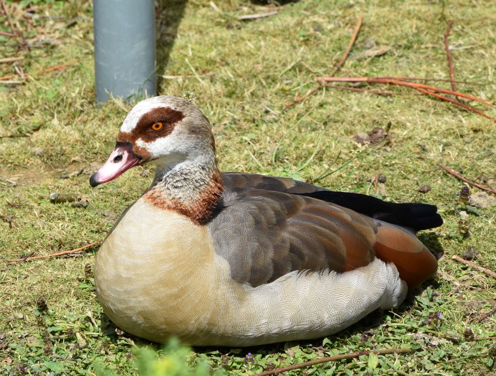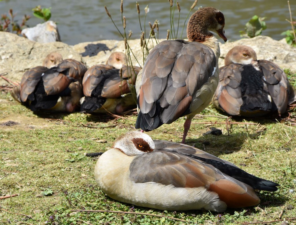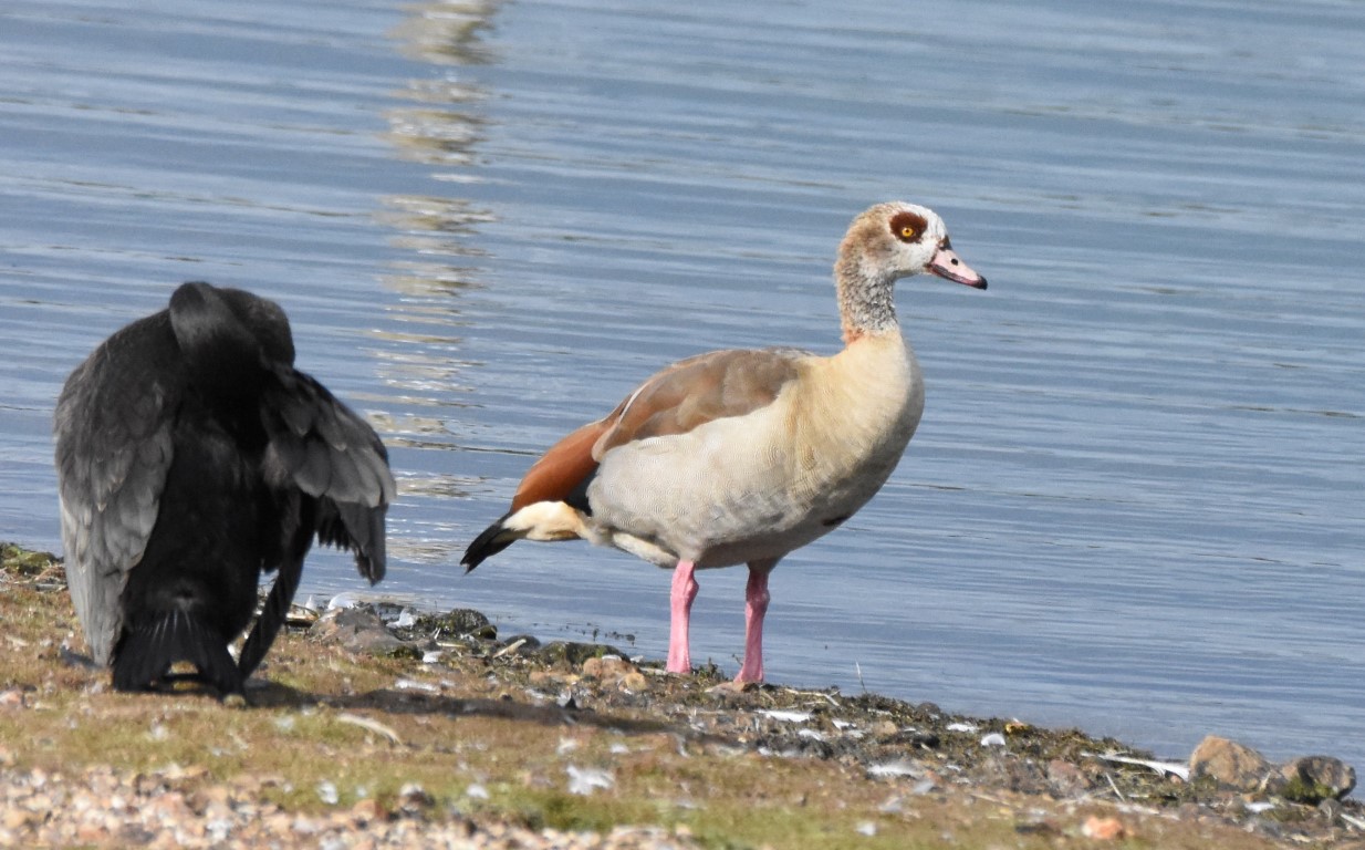 The Egyptian Goose is a light coloured medium sized goose. It is brown on the upper parts with black outer wings but white inner wings. It has a distinctive dark brown patch around the eye, and a ring at the base of the neck. The bill is pink, as are the long legs. Egyptian geese were introduced to the UK in the 1700’s
