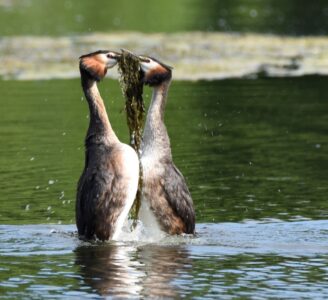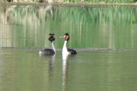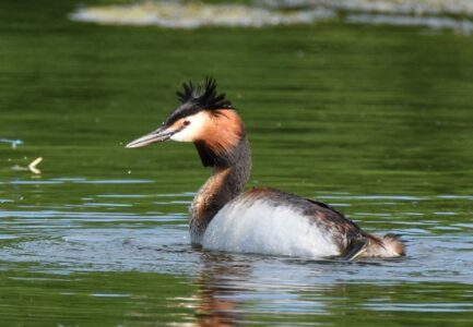 The Great Crested Grebe is an elegant bird and is found on many larger lakes. It has a long pointed beak and in summer has an orange neck crest and black head crest. In winter the cress are lost and the head is mainly white with a black crown. The back and wings are dark in colour, the front of the neck is white. The bird as most at home on water, it dives well but finds taking to the air an arduous process.