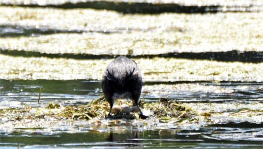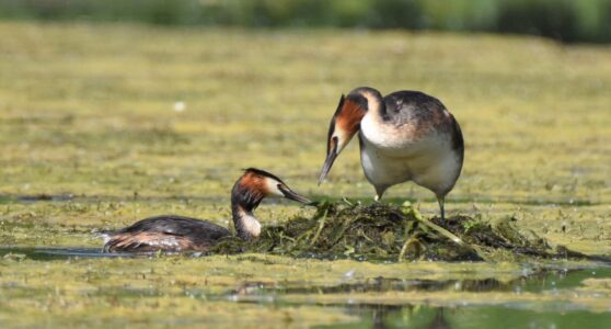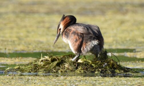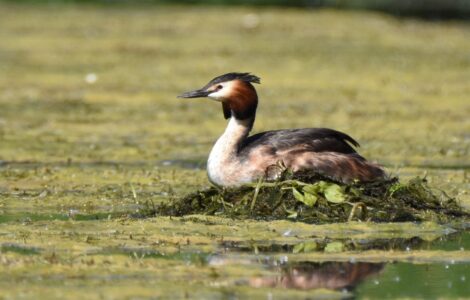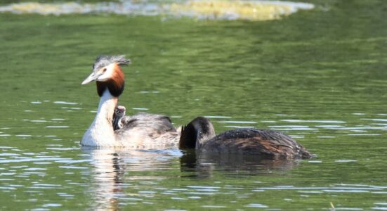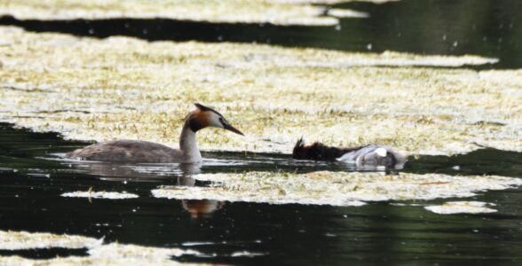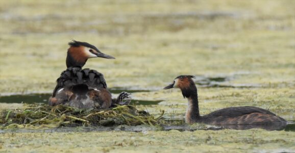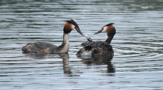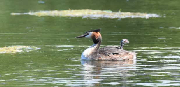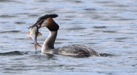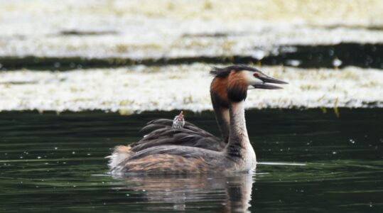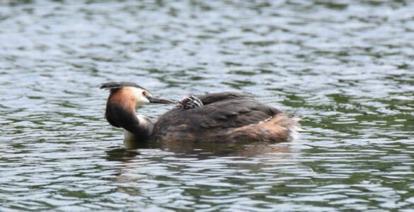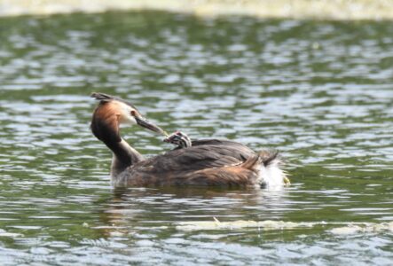 Small fish are the staple diet of the Great Crested Grebe, which they capture diving. They can remain up to 45 seconds under water. They nest on floating platforms, and the female can often be seen carrying her brood on her back in summer.