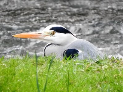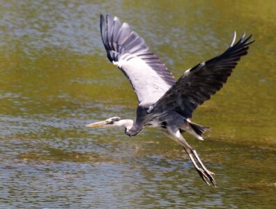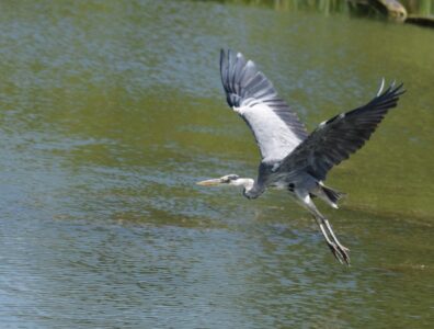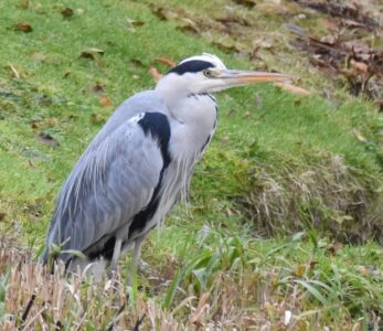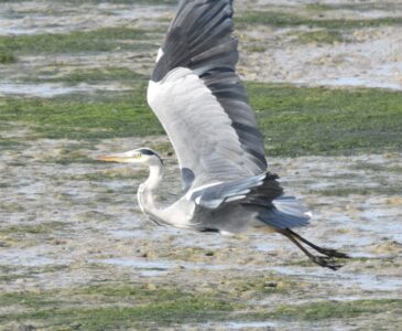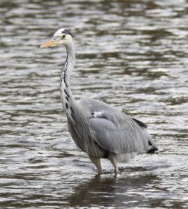 The Grey Heron is a very large and slightly awkward looking bird. It has a long white neck with black streaking on its underside, long yellow legs, and a long pointed yellow beak. The wings are grey with black patches at the shoulder, the wings have black ends which can be seen during flight.