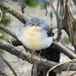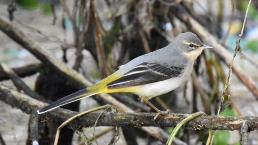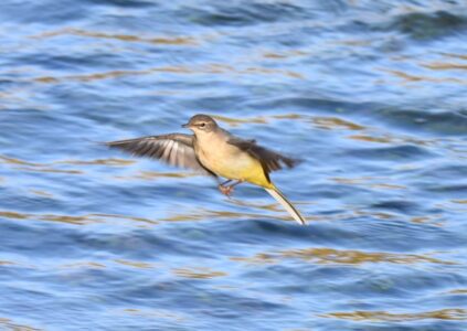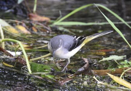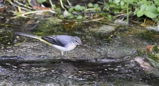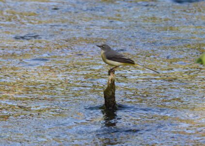 The Grey Wagtail is the largest of the wagtail species of the British Isles. It has a grey head and back and yellow underparts. A black horizontal stripe is present on either side of the eye. The male has a black bib under the bill. Like all wagtails it bobs its tail up and down giving the impression of imminent flight. The Yellow Wagtail is similar in size but has an olive green back.