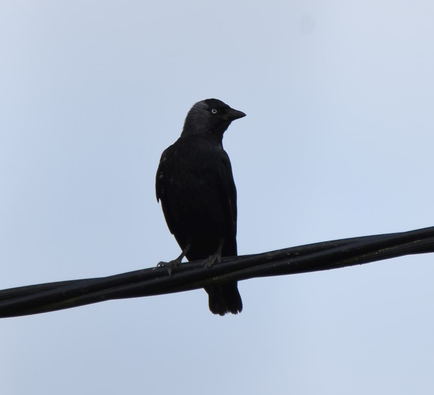 The Jackdaw is the smallest of the British Isles crow species. It has black plumage apart from the black of the head and nape of the neck which is a grey colour. Its light coloured eyes stand out against its black face. It has a short bill compared to the Carrion Crow.