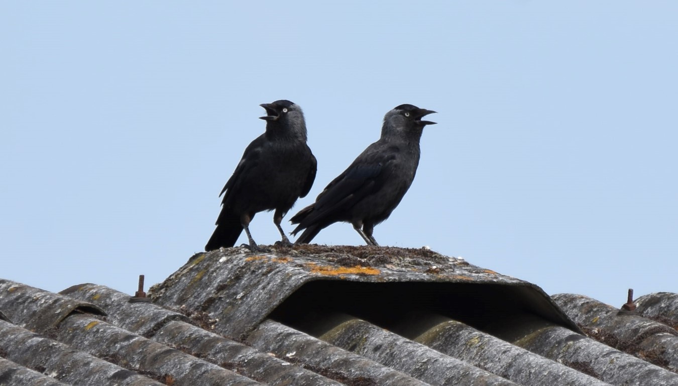 Jackdaws are very gregarious birds that flock together into large groups. They pair-bond for life and build loose nests in trees and crevices in old buildings. Jackdaws steal eggs and young from the nests of other birds, but mostly feed on a wide variety of seeds and invertebrates and carrion.
