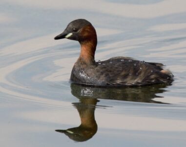 The Little Grebe is a small water bird. In summer a large red patch develops on the otherwise black neck. The bill is short and black with a bright light bar at the base. The head and back are black and the flanks brown with a white patch under the very short tail. In winter the colours tone down to shades of brown.