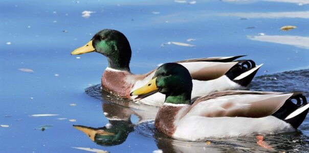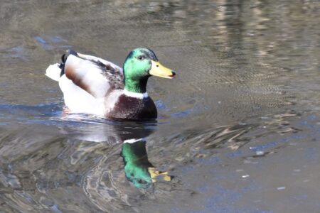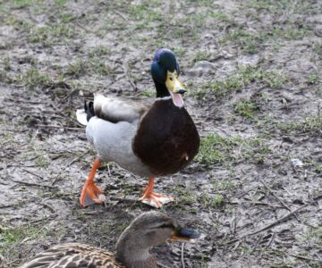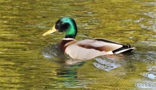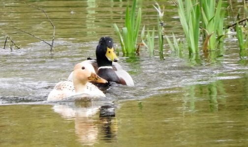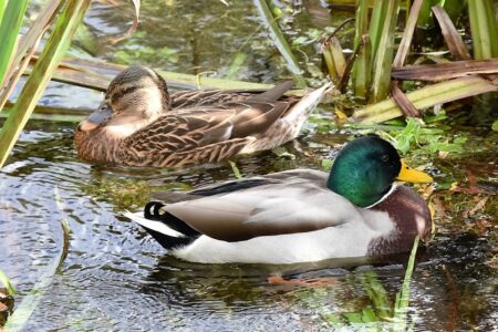 The Mallard is the most familiar of the British Isle ducks. Female and male Mallards look very different. The male has a distinct green head, a yellow bill and a thin white neck ring. The body is generally grey and brown although the rear is black. The female is less distinctive with a speckled brown appearance and orange bill. Both sexes have a blue patch on the wing that can be seen during flight.