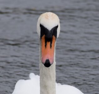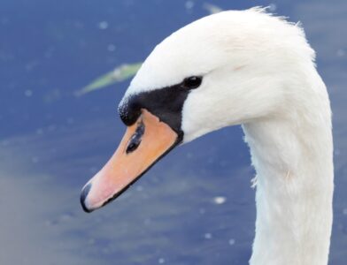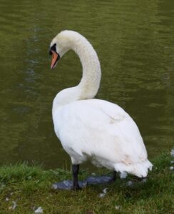 The Mute Swan is a very large, white water bird which is very common in many regions of the British Isles. It has along āSā shaped neck and an orange bill behind which the face is black. The legs are black and relatively short.