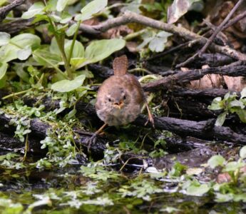 The Wren is a tiny bird, the second smallest species in the British Isles. It has a brown crown, back and wings with dark barring. The tail is often cocked upwards and has dark bars on it. The underparts are light in colour, as is the face part from a dark stripe that runs through the eye. The bill is dark and thin.