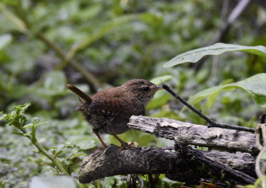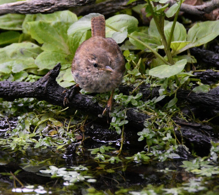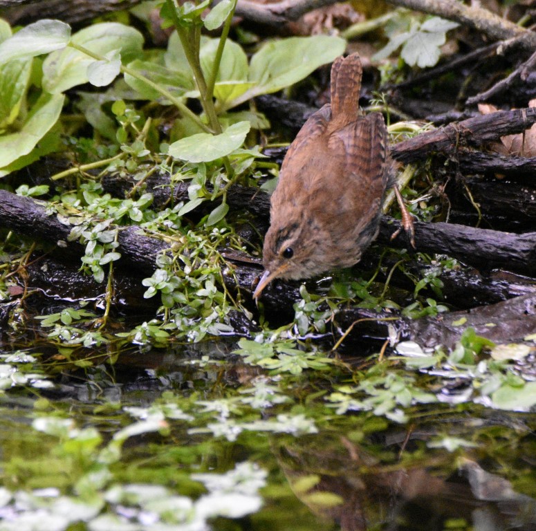 The Wren is a tiny bird, the second smallest species in the British Isles. It has a brown crown, back and wings with dark barring. The tail is often cocked upwards and has dark bars on it. The underparts are light in colour, as is the face part from a dark stripe that runs through the eye. The bill is dark and thin.